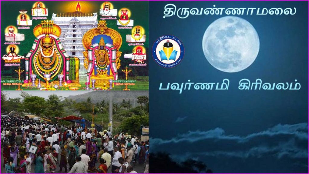 இந்த மாதம்  பவுர்ணமி வருகிற 6-ந்தேதி திங்கட்கிழமை வருகிறது. அன்றைய தினம்   பவுர்ணமி காலை 11.49 மணிக்கு தொடங்கி மறுநாள் (செவ்வாய்க்கிழமை) காலை 9.53 மணிக்கு நிறைவடைகிறது. இந்த நேரத்தில் கிரிவலம் செல்லலாம் என்று தெரிவிக்கப்பட்டுள்ளது.