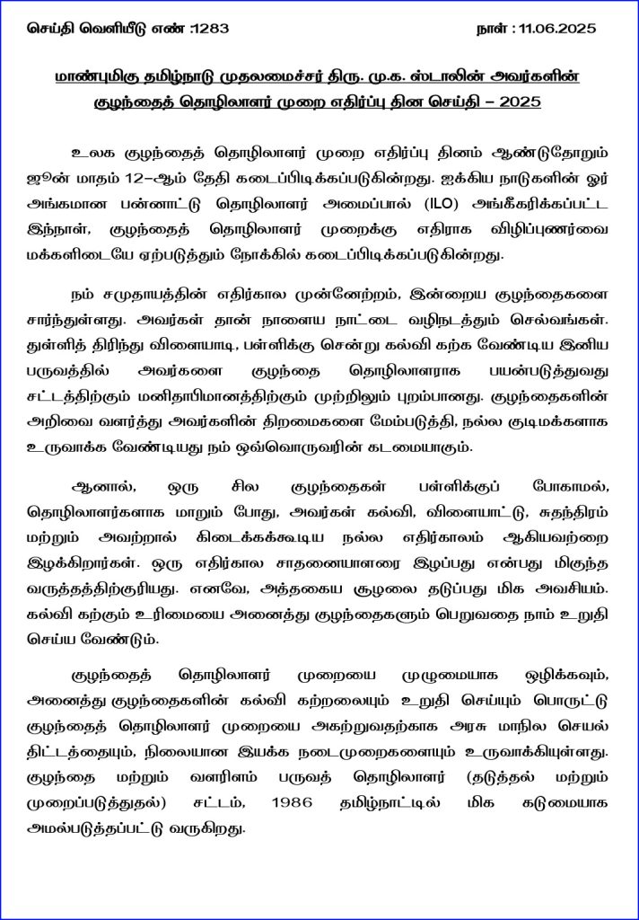 நாளை உலகம் முழுவதும் குழந்தை தொழிலாளர் மறை எதிர்ப்பு நாள் கடைபிடிக்கப்படுகிறது. இதையொட்டி, முதல்வர் ஸ்டாலின் வெளியிட்ட செய்திக் குறிப்பில் கூறியிருப்பதாவது,