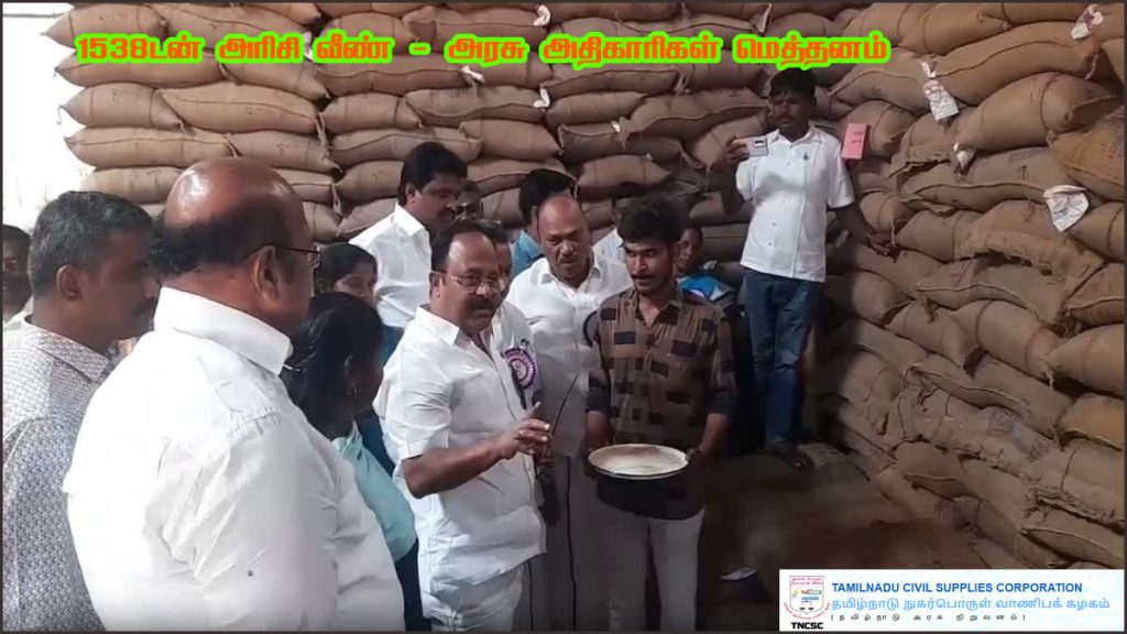 ஏற்கனவே விவசாயிகளின் நெல்மூட்டைகள் வைத்திருக்கும் பகுதிகளில் முறையான வசதிகள் ஏற்படுத்தராமல் இருக்கும் தமிழ்நாடு அரசு மற்றும் அதிகாரிகளின் மெத்தனத்தால் பல ஆயிரம் டன் நெல்மூட்டைகள் மழைகள் நனைந்து விவசாயிகளுக்கு பேரிழப்பை ஏற்படுத்தி வரும் நிலையில், குடோனில் பாதுகாப்பாக வைக்கப்பட்டிருந்த 1,538 டன் அரிசி அதிகாரிகளின் மெத்தனத்தால் வீணடிக்கப்பட்டு உள்ளது அதிர்ச்சியை ஏற்படுத்தி உள்ளது.