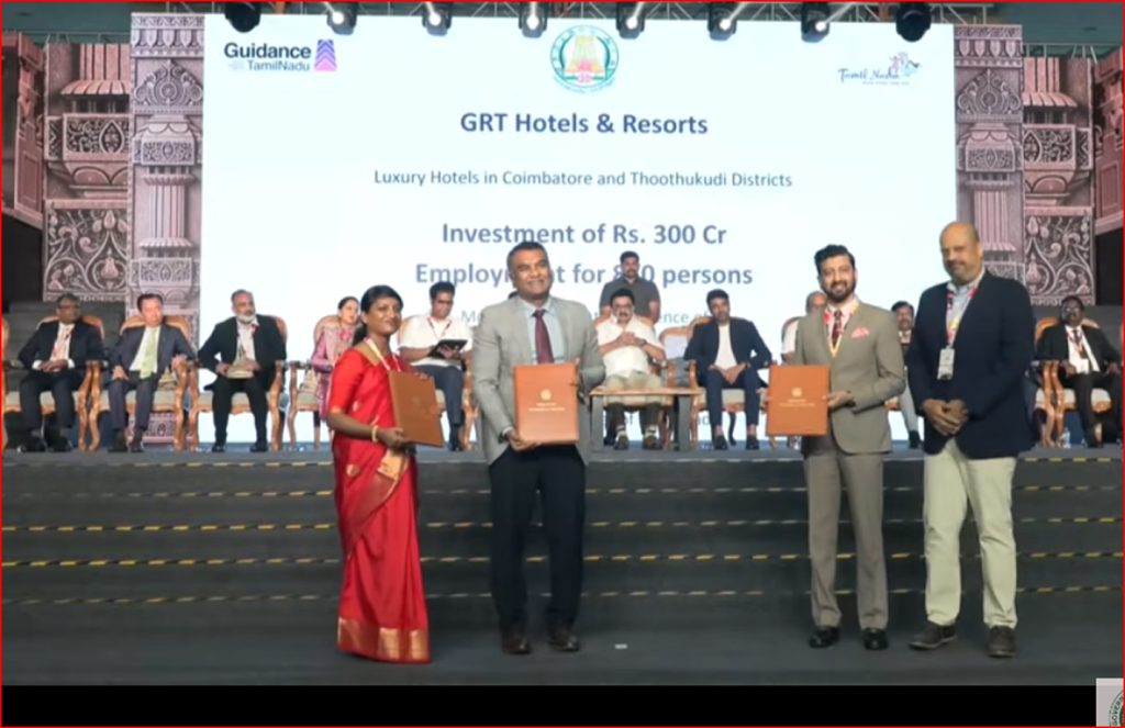 மாமல்லபுரம் அருகே நடக்கும் உலகளாவிய சுற்றுலா மாநாட்டில் புரிந்துணர்வு ஒப்பந்தம் கையெழுத்தாகின.brihade hotel ventures நிறுவனம் தமிழ்நாட்டில் ரூ.1,100 கோடி முதலீடு செய்கிறது. இதன் மூலம் 900 பேருக்கு வேலைவாய்ப்புகள் கிடைக்கும் என தெரிவிக்கப்பட்டுள்ளது.