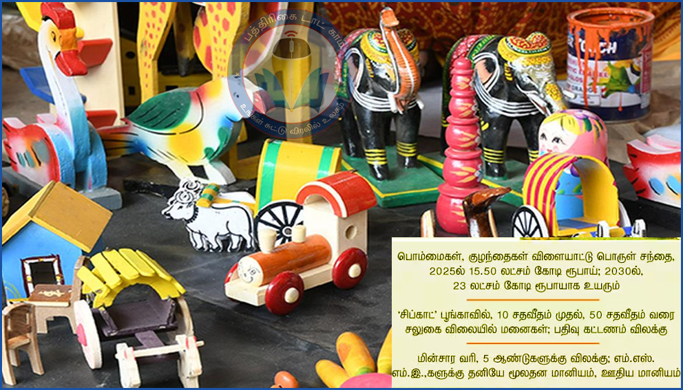 பொம்மைகள், குழந்தைகள் விளையாட்டு பொருள் சந்தை, 2025ல் 15.50 லட்சம் கோடி ரூபாய் ; 2030ல், 23 லட்சம் கோடி ரூபாயாக உயரும் ‘சிப்காட்’ பூங்காவில், 10 சதவீதம் முதல், 50 சதவீதம் வரை சலுகை விலையில் மனைகள்; பதிவு கட்டணம் விலக்கு மின்சார வரி, 5 ஆண்டுகளுக்கு விலக்கு; எம்.எஸ்.எம்.இ.,களுக்கு தனியே மூலதன மானியம், ஊதிய மானியம் என பல்வேறு சலுகைகளை அறிவித்துள்ளது.