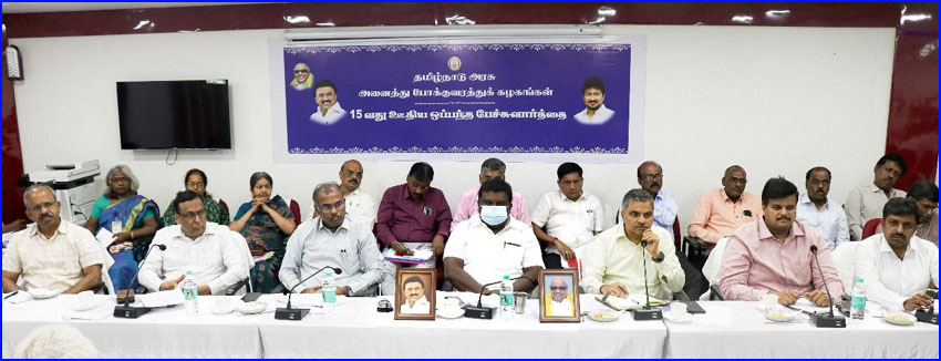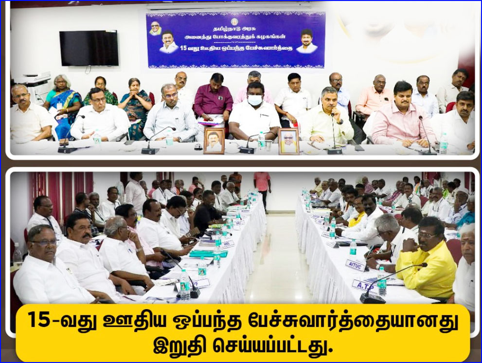 திமுக ஆட்சி பொறுப்பேற்ற பின் 14 மற்றும் 15-வது ஊதிய ஒப்பந்த பேச்சுவார்த்தை வெற்றிகரமாக முடிந்துள்ளது.