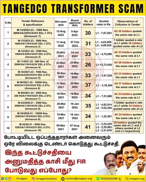 தமிழ்நாடு அரசு மின்வாரியத்திற்கு கொள்முதல் செய்யப்பட்ட டிரான்ஸ்பார்களில் முறைகேடு நடைபெற்றுள்ளதாக ஏற்கனவே குற்றம் சாட்டியது. இதுதொடர்பான டென்டரில போட்டியிட்ட அனைவரும் ஒரே விலைக்கு டெண்டர் கொடுக்க வைக்கப்படுகிறார்கள். ஒரே விலைக்கு டெண்டர் கொடுத்தவர்களிடம் கூடி பேசி ஆளுக்கு கொஞ்சம் டெண்டர் சந்தை விலையை விட மிக அதிக விலைக்கு முடிவு செய்யப்பட்டு பிரித்து கொடுக்கப்படுகிறது என குற்றம் சாட்டியிருந்தது.