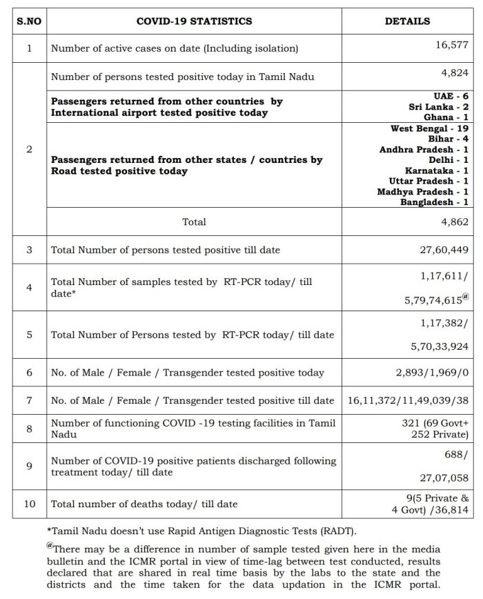 மிழகத்தில் இன்று 4,862 பேருக்கு கொரோனா பாதிப்பு உறுதி செய்யப்பட்டு மொத்தம் 27,60,449 பேர் பாதிக்கப்பட்டுள்ளனர்