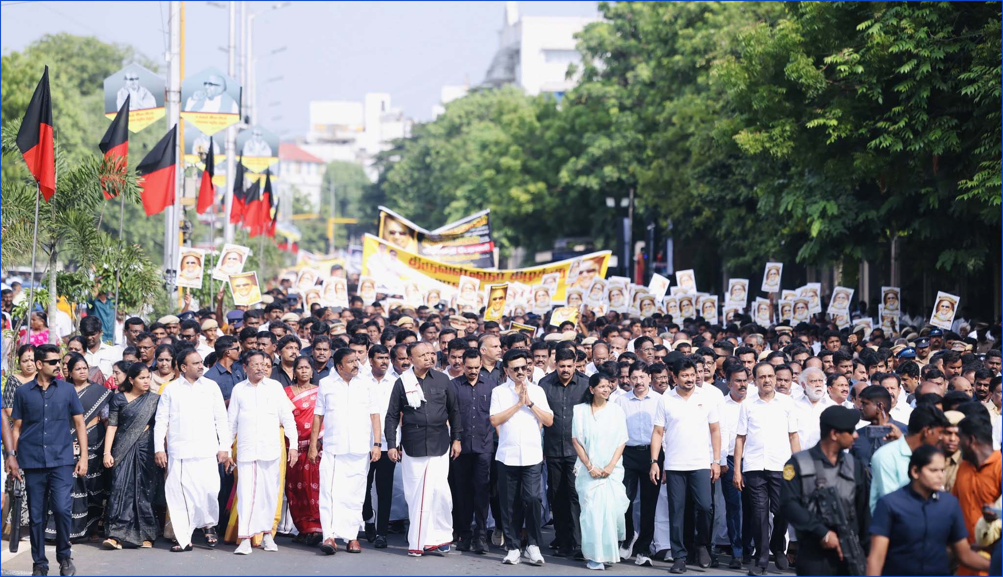 இதில், முதல்வர் மு.க.ஸ்டாலின், துணை முதல்வர் உதயநிதி ஸ்டாலின், திமுக எம்.பி. கனிமொழி, அமைச்சர்கள் கே.என்.நேரு, எ.வ.வேலு உள்ளிட்டோர், கட்சி நிர்வாகிகள், தொண்டர்கள் பேரணியாக செல்கின்றனர்.