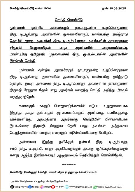 திருமதி ரேணுகா தேவி பாலு அவர்களை இழந்து தவிக்கும் நண்பர் திரு. டி.ஆர்.பாலு, தம்பி திரு. டி.ஆர்.பி.ராஜா ஆகியோருக்கும் அவரது குடும்பத்தினருக்கும் எனது ஆழ்ந்த இரங்கல்” என தெரிவித்துள்ளார்.