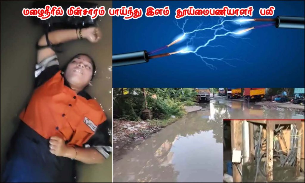 சென்னை கண்ணகி நகர் பகுதியை சார்ந்தவர் திருமதி வரலட்சுமி அவர்கள் இன்று காலை தூய்மை பணி வேலை செய்து வரும் வேலைக்கு செல்லும்போது மழை நீரில் உள்ள கேபிள் மீது தெரியாமல் காலை வைத்ததால், அதில் பாய்ந்த மின்சாரம் தாக்கி உயிரிழந்தார். இந்த சோகம் இன்று காலை 4 50 மணி அளவில் நடைபெற்றுள்ளது.