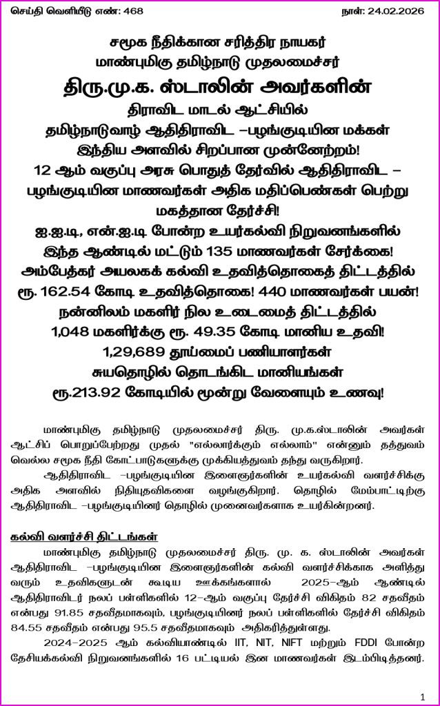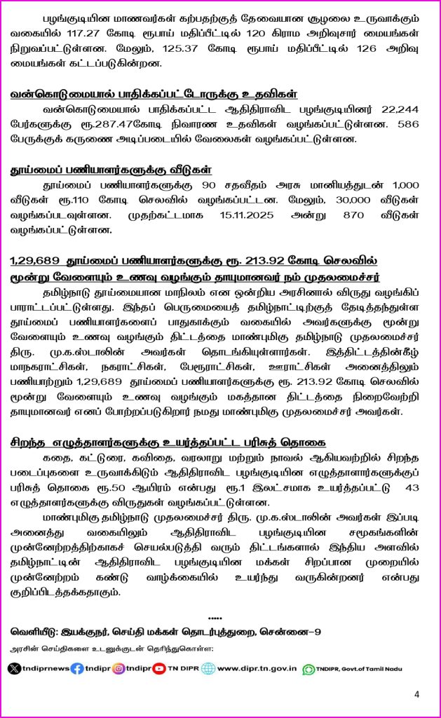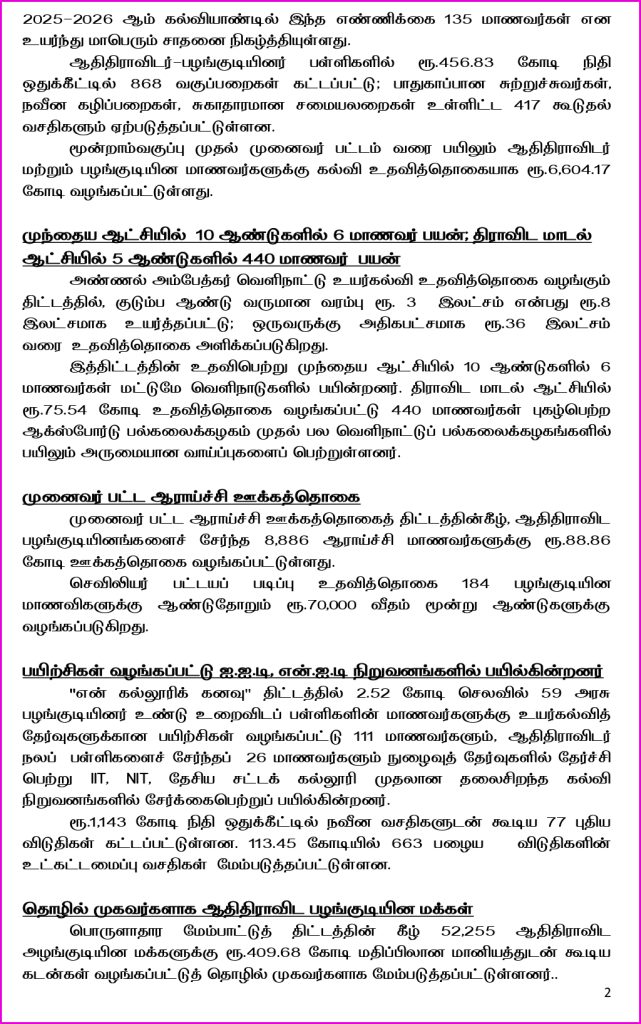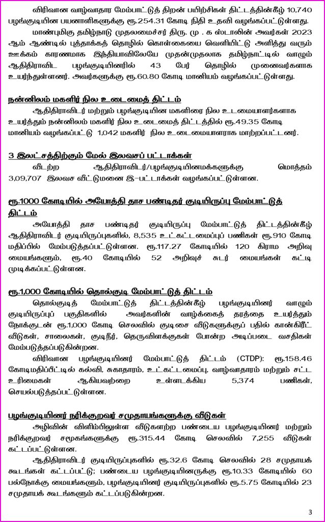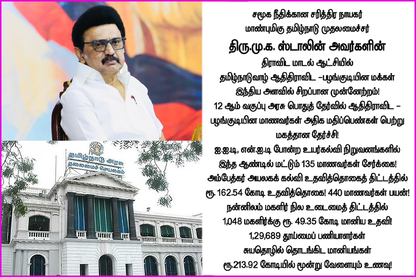 கடந்த 5ஆண்டு கால திராவிட மாடல் ஆட்சியில் ஆதிதிராவிட – பழங்குடியின மக்கள் இந்திய அளவில் சிறப்பான முன்னேற்றம் அடைந்துள்ளதாக தமிழக அரசு தெரிவித்துள்ளது.