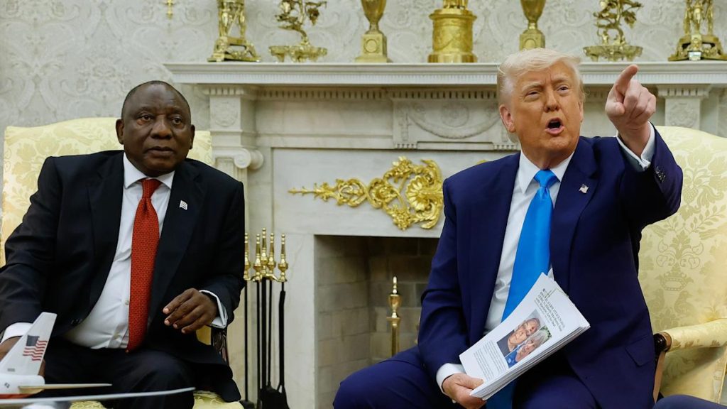 அமெரிக்கா சென்றுள்ள தென்னாப்பிரிக்க அதிபர் சிரில் ராமபோசாவுடன் அமெரிக்க அதிபர் டொனால்ட் டிரம்ப் ஓவல் அலுவலகத்தில் புதன்கிழமையன்று செய்தியாளர்களை சந்தித்தார்.
