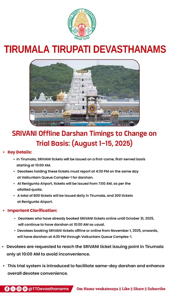 ஆகஸ்ட் 1 முதல் ஆகஸ்ட் 15, 2025 வரை சோதனை அடிப்படையில் கொண்டு வரப்படும் இந்த மாற்றம், பக்தர்கள் ஒரே நாளில் தரிசனம் செய்ய உதவும்.