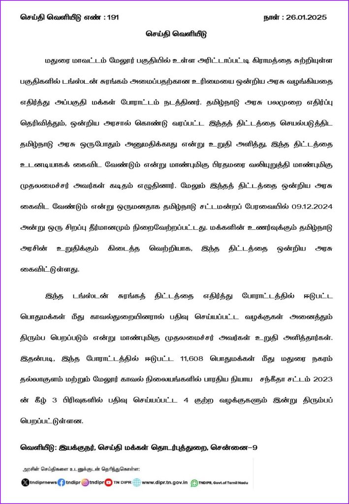 இந்நிலையில், டங்ஸ்டன் சுரங்கத் திட்டத்தை எதிர்த்து போராட்டத்தில் ஈடுபட்ட பொதுமக்கள் மீது காவல்துறையினரால் பதிவு செய்யப்பட்ட வழக்குகள் அனைத்தும் திரும்ப பெறப்படும் என்று முதலமைச்சர் அவர்கள் உறுதி அளித்தார்.