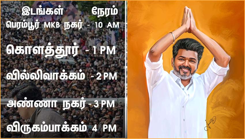 .இதனிடையே ஒரே நாளில் 5 தொகுதிகளில் வாகன பிரசாரம் மேற்கொள்ள அனுமதி கோரி த.வெ.க. சார்பில் மனு அளிக்கப்பட்டுள்ளது. அனுமதி கோரி வழங்கப்பட்டுள்ள மனுவில், காலை 10 மணி முதல் மாலை 4 மணி வரை பெரம்பூர், கொளத்தூர், வில்லிவாக்கம், அண்ணாநகர், விருகம்பாக்கம் ஆகிய 5 தொகுதிகளில் வாகன பிரசாரம் மேற்கொள்ள திட்டமிடப்பட்டுள்ளது. ஒவ்வொரு இடத்திலும் 3 ஆயிரம் பேர் பங்கேற்பார்கள் என்று தெரிவிக்கப்பட்டுள்ளது