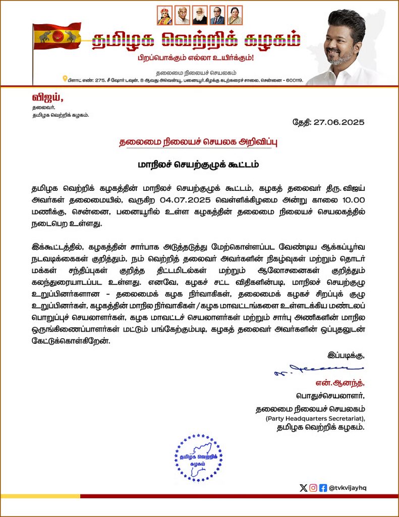 இதுதொடர்பாக தவெக கட்சியின் பொதுச் செயலாளர் எஸ். ஆனந்த் வெளியிட்டுள்ள அறிக்கையில், “தமிழக வெற்றிக் கழகத்தின் மாநிலச் செயற்குழுக் கூட்டம், கழகத் தலைவர் விஜய் தலைமையில் வருகிற 04.07.2025 வெள்ளிக்கிழமை அன்று காலை 10.00 மணிக்கு சென்னை, பனையூரில் உள்ள கழகத்தின் தலைமை நிலையச் செயலகத்தில் நடைபெற உள்ளது. இக்கூட்டத்தில், கழகத்தின் சார்பாக அடுத்தடுத்து மேற்கொள்ளப்பட வேண்டிய ஆக்கப்பூர்வ நடவடிக்கைகள் குறித்தும் நம் வெற்றித் தலைவரின் நிகழ்வுகள் மற்றும் தொடர் மக்கள் சந்திப்புகள் குறித்த திட்டமிடல்கள் மற்றும் ஆலோசனைகள் குறித்தும் கலந்துரையாடப்பட உள்ளது. எனவே, கழகச் சட்ட விதிகளின்படி, மாநிலச் செயற்குழு உறுப்பினர்களான தலைமைக் கழக நிர்வாகிகள், தலைமைக் கழகச் சிறப்புக் குழு உறுப்பினர்கள், கழகத்தின் மாநில நிர்வாகிகள் / கழக மாவட்டங்களை உள்ளடக்கிய மண்டலப் பொறுப்புச் செயலாளர்கள். கழக மாவட்டச் செயலாளர்கள் மற்றும் சார்பு அணிகளின் மாநில ஒருங்கிணைப்பாளர்கள் மட்டும் பங்கேற்கும்படி, கழகத் தலைவர் ஒப்புதலுடன் கேட்டுக்கொள்கிறேன்”.