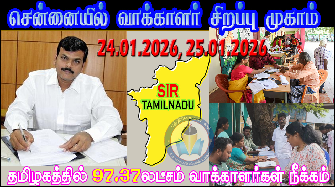 தமிழ்நாட்டில் எஸ்ஐஆர் பணிகளுக்கு பிறகு வெளியான வரைவு வாக்காளர் பட்டியலில் சுமார் லட்சம் பேர் நீக்கப்பட்ட நிலையில், பெயர் விடுபட்டவர்கள் மீண்டும் பெயர்களை சேர்க்க கால அவகாசம் இந்த மாதம் இறுதி வரையில் நீட்டிக்கப்பட்டுள்ள நிலையில், வரும் சனி, ஞாயிறு ஆகிய இரு நாட்கள் வாக்காளர் சிறப்பு முகாம் நடைபெறும் என சென்னை மாநகராட்சி அறிவித்து உள்ளது.