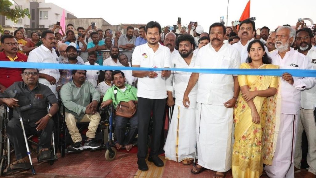 துணை முதல்வர் உதயநிதி பெசண்ட் நகர் கடற்கரையில் மாற்று திறனாளிகளுக்கான சிறப்பு பாதையை திறந்து வைத்துள்ளார்/
