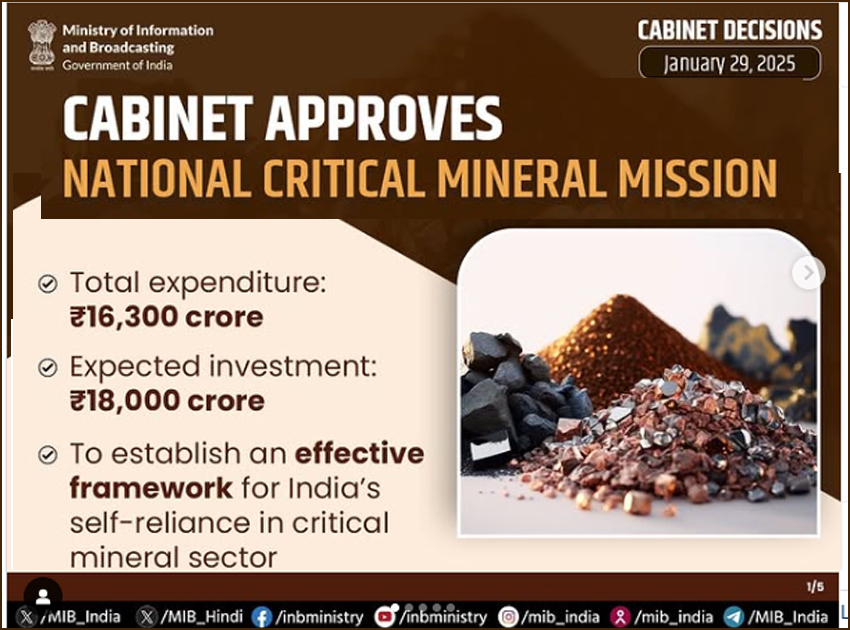 பிரதமர் நரேந்திர மோடி தலைமையில் நடைபெற்ற மத்திய அமைச்சரவைக் கூட்டத்தில், 16,300 கோடி ரூபாய் செலவிலும் பொதுத்துறை நிறுவனங்களின் ரூ.18,000 கோடி முதலீட்டுடனும் “முக்கியத்துவம் வாய்ந்த கனிமங்களுக்கான தேசிய இயக்கத்தை தொடங்குவதற்கு ஒப்புதல் அளிக்கப்பட்டுள்ளது.