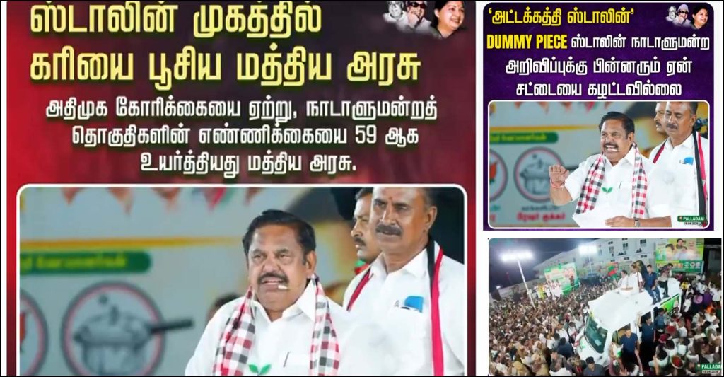 தமிழ்நாட்டின் நாடாளுமன்ற எண்ணிக்கை குறைந்துவிடும் என்று ஸ்டாலின் கூறி வருகிறார்.. மக்களை ஏமாற்றி வருகிறார். ஆனால்,   நான் ஏற்கனவே  இதுகுறித்து,  தெளிவுபடுத்தினேன். தமிழ்நாட்டிற்கு விழுக்காடு குறையாது என்று கூறினேன். ஆனால்,   அதன்பிறகும் வேண்டு மென்றே ஸ்டாலின் கருப்புச் சட்டை போட்டிருக்கிறார் என   விமர்சித்த எடப்பாடி, தற்போது, மத்திய பாஜக அரசு ஸ்டாலின் முகத்தில் கரி பூசிவிட்டது என்றார்.