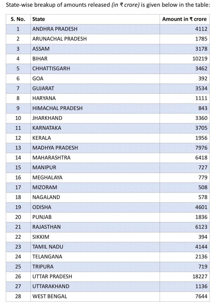 அதிக பட்சமாக உத்தரபிரதேச மாநிலத்துக்கு ரூ.18,227 கோடியும், பீகாருக்கு ரூ.10,219 கோடியும், மத்திய பிரதேசத்துக்கு ரூ. 7976 கோடியும், மேற்கு வங்க மாநிலத்துக்கு ரூ. 7644 கோடியும் விடுவிக்கப்பட்டு உள்ளது. குறைந்த பட்சமாக பீகாருக்கு 392 கோடி ஒதுக்கி உள்ளது.