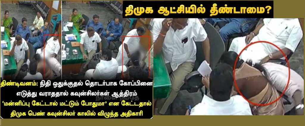 இந்த நிலையில், தீண்டாமையின் உச்சமாக, அரசு அலுவரை, சாதிய ரீதியாக திமுக கவுன்சிலர் காலில் விழவைத்த கொடுமை அரங்கேறி உள்ளது. இதையடுத்து, அவர்கள்மீது வன்கொடுமை வழக்கு பதிவு செய்யப்பட்ட நிலையில் திமுக கவுன்சிலர் கணவருடன் தலைமறைவாகி உள்ளார். இது பெரும் பரபரப்பை எற்படுத்தி உள்ளதுடன், அதிமுக அரசுமீது கடுமையான விமர்சனங்களை ஏற்படுத்தி உள்ளது.