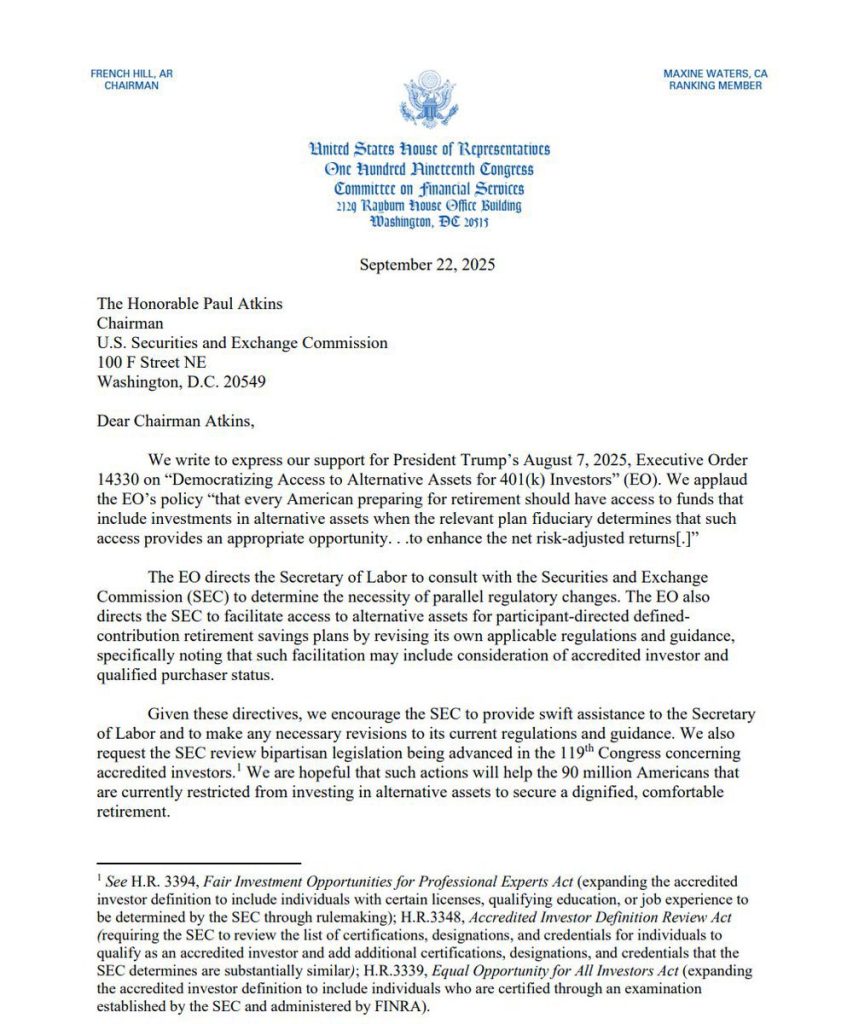 ஓய்வூதியத் திட்டங்களில் கிரிப்டோ முதலீடுகளை அனுமதிக்கும் டிரம்பின் நிர்வாக உத்தரவு மீது விரைவில் நடவடிக்கை எடுக்க வலியுறுத்தி அமெரிக்க நாடாளுமன்ற உறுப்பினர்கள் கடிதம் அனுப்பியுள்ளனர்.