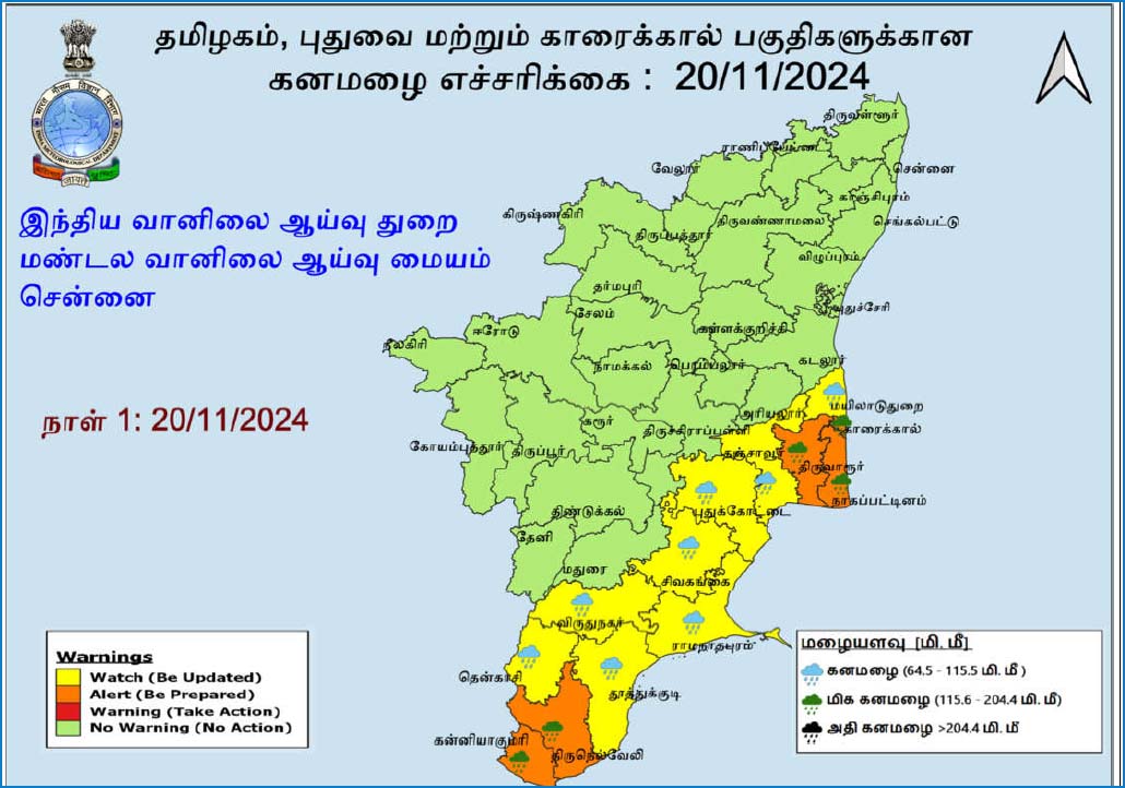 26-11-2024: மயிலாடுதுறை, திருவாரூர், தஞ்சாவூர், நாகப்பட்டினம், புதுக்கோட்டை மாவட்டங்கள், காரைக்கால் பகுதிகளில் கன முதல் மிக கன மழையும், செங்கல்பட்டு, விழுப்புரம், கடலூர், பெரம்பலூர், அரியலூர், திருச்சிராப்பள்ளி, சிவகங்கை, ராமநாதபுரம், தூத்துக்குடி, திருநெல்வேலி, கன்னியாகுமரி மாவட்டங்கள் மற்றும் புதுவையில் ஓரிரு இடங்களில் கனமழையும் பெய்ய வாய்ப்புள்ளது.