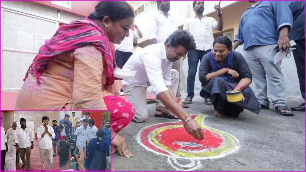 இந்த நிலையில், தனது கட்ச நிர்வாகிகளுடன் ஆலோசனை நடத்துவதற்காக விஜய் நேற்று மாலை (ஏப் 18) திடீரென பெரம்பூர் சென்றார். அங்கு தனது கட்சி நிர்வாகிகளுடன் கட்சிப்பணிகள் குறித்து ஆலோசனை நடத்தினார். பெரம்பூரில் நடக்கும் பரப்புரை பணிகள் குறித்து கட்சி நிர்வாகிகளிடம் கேட்டறிந்தார். பின்னர், கட்சியின் வாசலில் தனது கட்சி பெண் நிர்வாகிகளுடன் இணைந்து விசில் கோலமிட்டார்.
