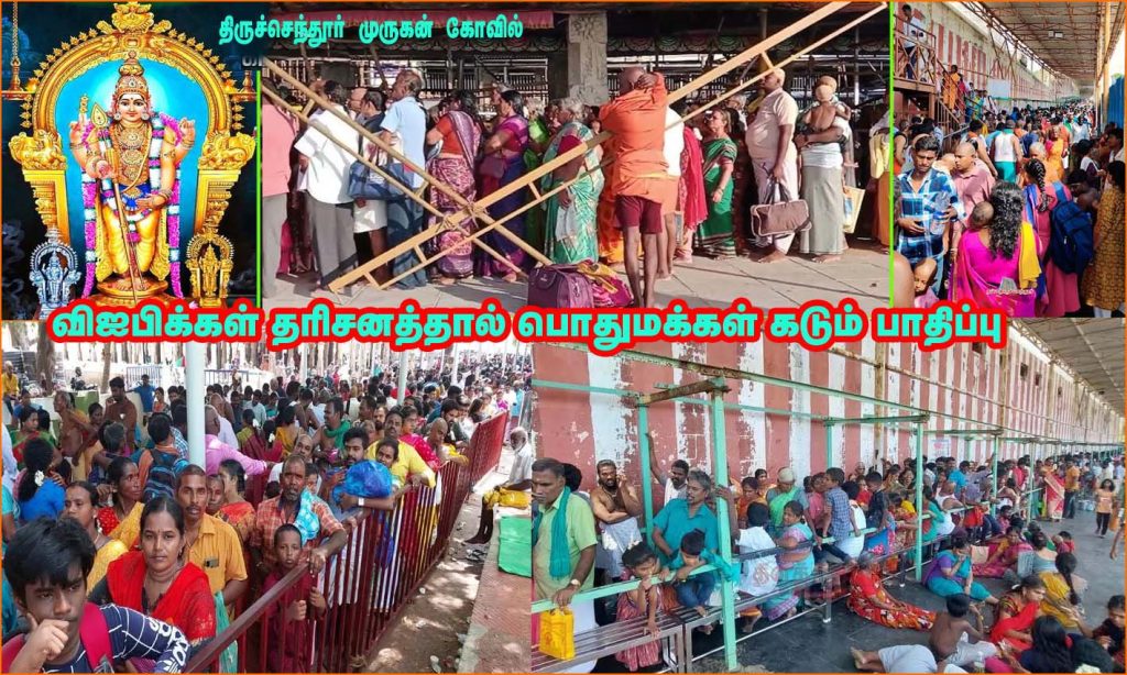 மதுரை: திருச்செந்தூர் கோயிலில் விஐபி, அரசு அதிகாரிகள், அரசியல் கட்சியினர் மற்றும் பணம் கொடுத்து என பலர் அதிகாரிகள் துணையோடு கோவிலுக்குள் கூட்டம் கூட்டமாக செல்வதால், பொதுமக்கள் கடுமையாக பாதிக்கப்பட்டு வருகின்றனர். பல மணி நேரம் கியூவில் கால்கடுக்க நிற்கும் நிலை உள்ளது. இதுதொடர்பான வழக்கை விசாரித்த உயர்நீதிமன்றம் மதுரை கிளை, அறநிலையத்துறை அதிகாரிகளை கடுமையாக சாடியது. அடுக்கடுக்கான கேள்விகளை எழுப்பிய நீதிபதிகள், விஐபிகளுக்காக பக்தர்கள் காத்திருக்க வேண்டுமா?” பக்தர்களின் கூட்ட நெரிசலை தவிர்க்க என்னென்ன நடவடிக்கை … Continue reading திருச்செந்தூர் கோயிலில் விஐபி, அரசு அதிகாரிகள், அரசியல் கட்சியினர் போன்றோர் தரிசனத்தால் பொதுவழியில் வரும் பக்தர்களுக்கு பாதிப்பு! அரசுக்கு உயர்நீதிமன்றம் கேள்வி…