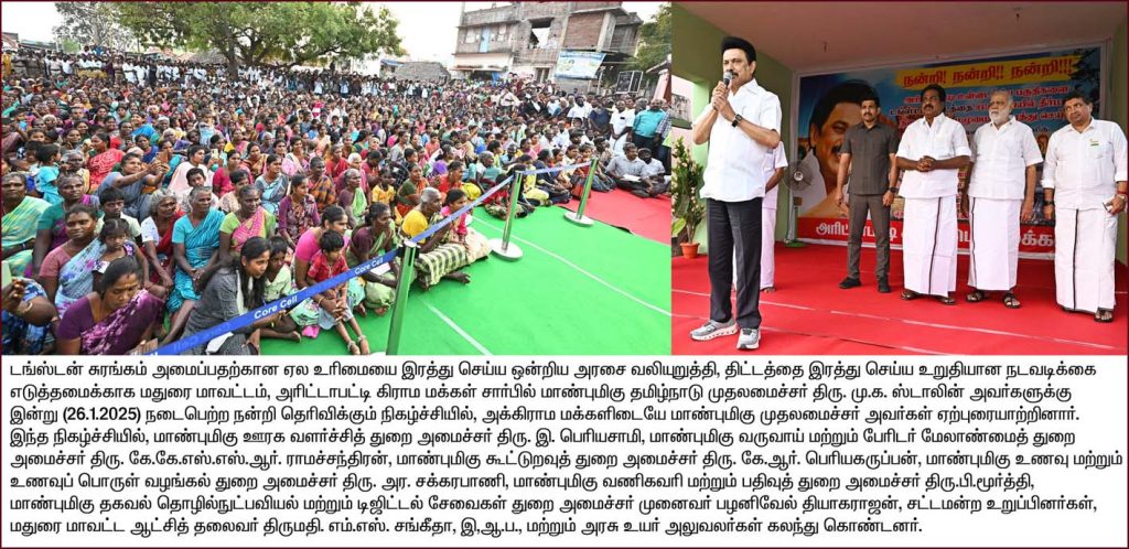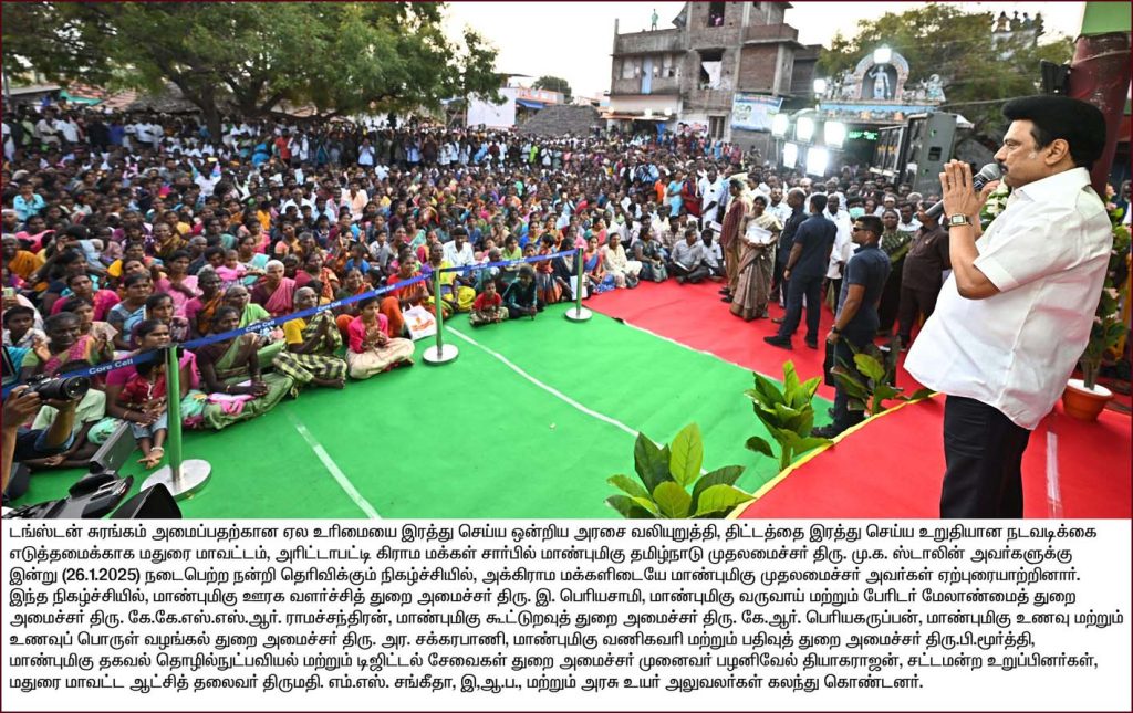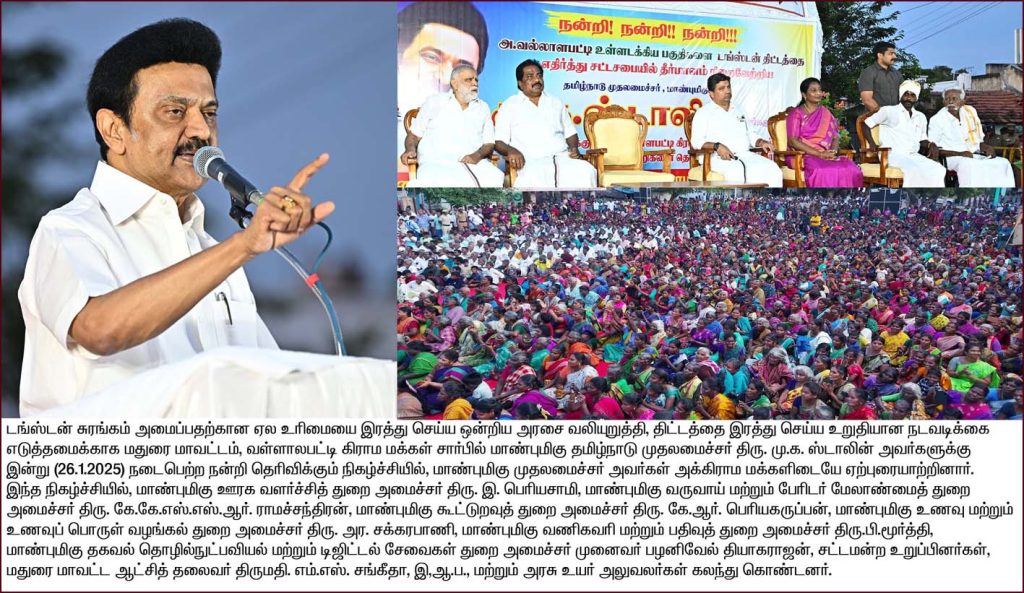 டங்ஸ்டன் சுரங்கம் அமைப்பதற்கான ஏல உரிமையை இரத்து செய்ய ஒன்றிய அரசை வலியுறுத்தி, திட்டத்தை இரத்து செய்ய உறுதியானு நடவடிக்கை எடுத்தமைக்காக மதுரை மாவட்டம், வள்ளாலபட்டி கிராம மக்கள் சார்பில் மிழ்நாடு முதலமைச்சர் மு.க.ஸ்டாலின்க்கு நடைபெற்ற நன்றி தெரிவிக்கும் நிகழ்ச்சியில், முதலமைச்சர் அவர்கள் அக்கிராம மக்களிடையே ஏற்புரையாற்றினார்.