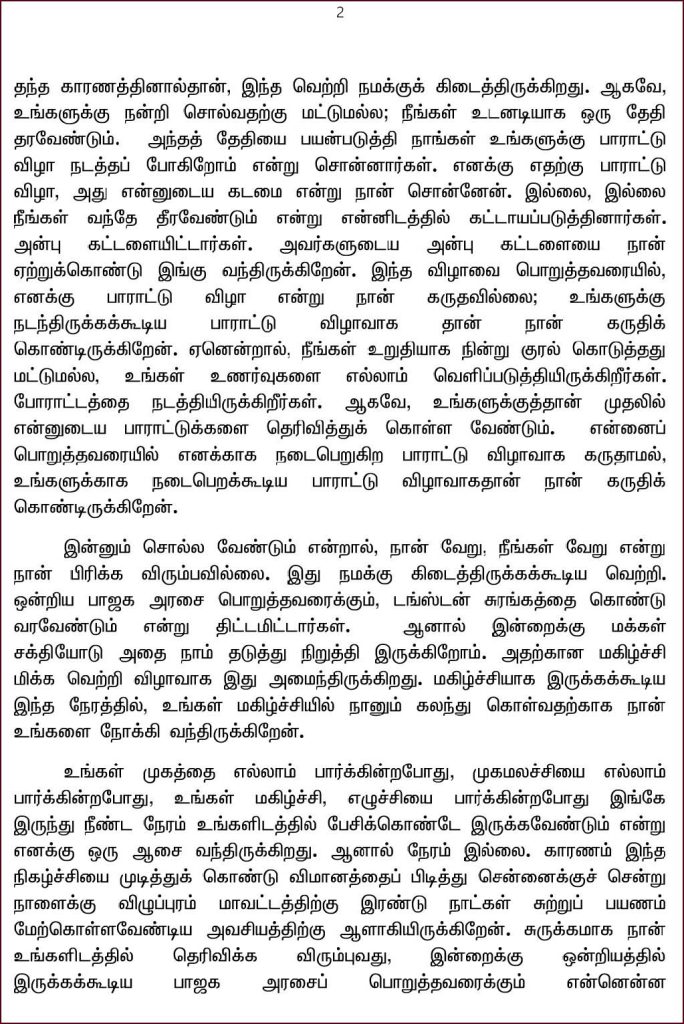 உங்கள் முகத்தை எல்லாம் பார்க்கின்றபோது, முகமலச்சியை எல்லாம் பார்க்கின்றபோது, உங்கள் மகிழ்ச்சி, எழுச்சியை பார்க்கின்றபோது இங்கே இருந்து நீண்ட நேரம் உங்களிடத்தில் பேசிக்கொண்டே இருக்கவேண்டும் என்று எனக்கு ஒரு ஆசை வந்திருக்கிறது. ஆனால் நேரம் இல்லை. காரணம் இந்த நிகழ்ச்சியை முடித்துக் கொண்டு விமானத்தைப் பிடித்து சென்னைக்குச் சென்று நாளைக்கு விழுப்புரம் மாவட்டத்திற்கு இரண்டு நாட்கள் சுற்றுப் பயணம் மேற்கொள்ளவேண்டிய அவசியத்திற்கு ஆளாகியிருக்கிறேன்.