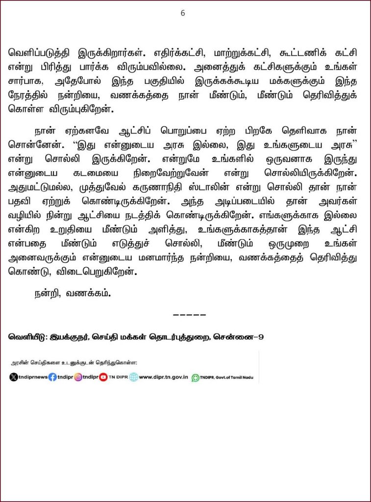 நான் ஏற்கனவே ஆட்சிப் பொறுப்பை ஏற்ற பிறகே தெளிவாக நான் சொன்னேன். “இது என்னுடைய அரசு இல்லை, இது உங்களுடைய அரசு” என்று சொல்லி இருக்கிறேன். என்றுமே உங்களில் ஒருவனாக இருந்து என்னுடைய கடமையை நிறைவேற்றுவேன்.