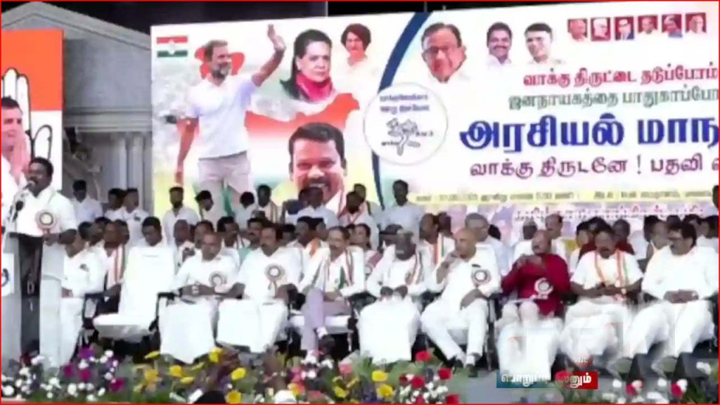 தமிழ்நாடு காங்கிரஸ் கமிட்டி சார்பில் நெல்லையில்,   ”வாக்கு திருட்டை தடுப்போம், ஜனநாயகத்தை பாதுகாப்போம்” என்ற தலைப்பில் மாநில மாநாடு  நடைபெற்றது.  மாநாட்டில், ‘தமிழக காங்கிரஸ் கட்சி தலைவர்கள் மற்றும் அகில இந்திய தலைவர்கள் என பலர் கலந்துகொண்டனர்.
