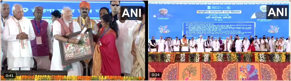 தொடர்ந்து, .காலநிலை நடவடிக்கை சிறப்பு பஞ்சாயத்து விருது (CASPA), ஆத்மா நிர்பார் பஞ்சாயத்து சிறப்பு விருது (ANPSA)களை வழங்கினார். பஞ்சாயத்து க்ஷம்தா நிர்மான் சர்வோத்தம் சன்ஸ்தான் ஆகியவை இதில் அடங்கும். பீகார் மாநிலம் மதுபானியில் அம்ரித் பாரத் எக்ஸ்பிரஸ் மற்றும் நமோ பாரத் விரைவு ரயிலை பிரதமர் நரேந்திர மோடி கொடியசைத்து தொடங்கி வைத்தார்.