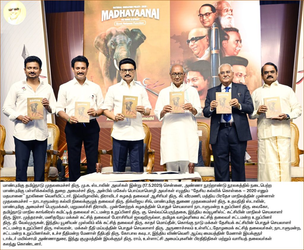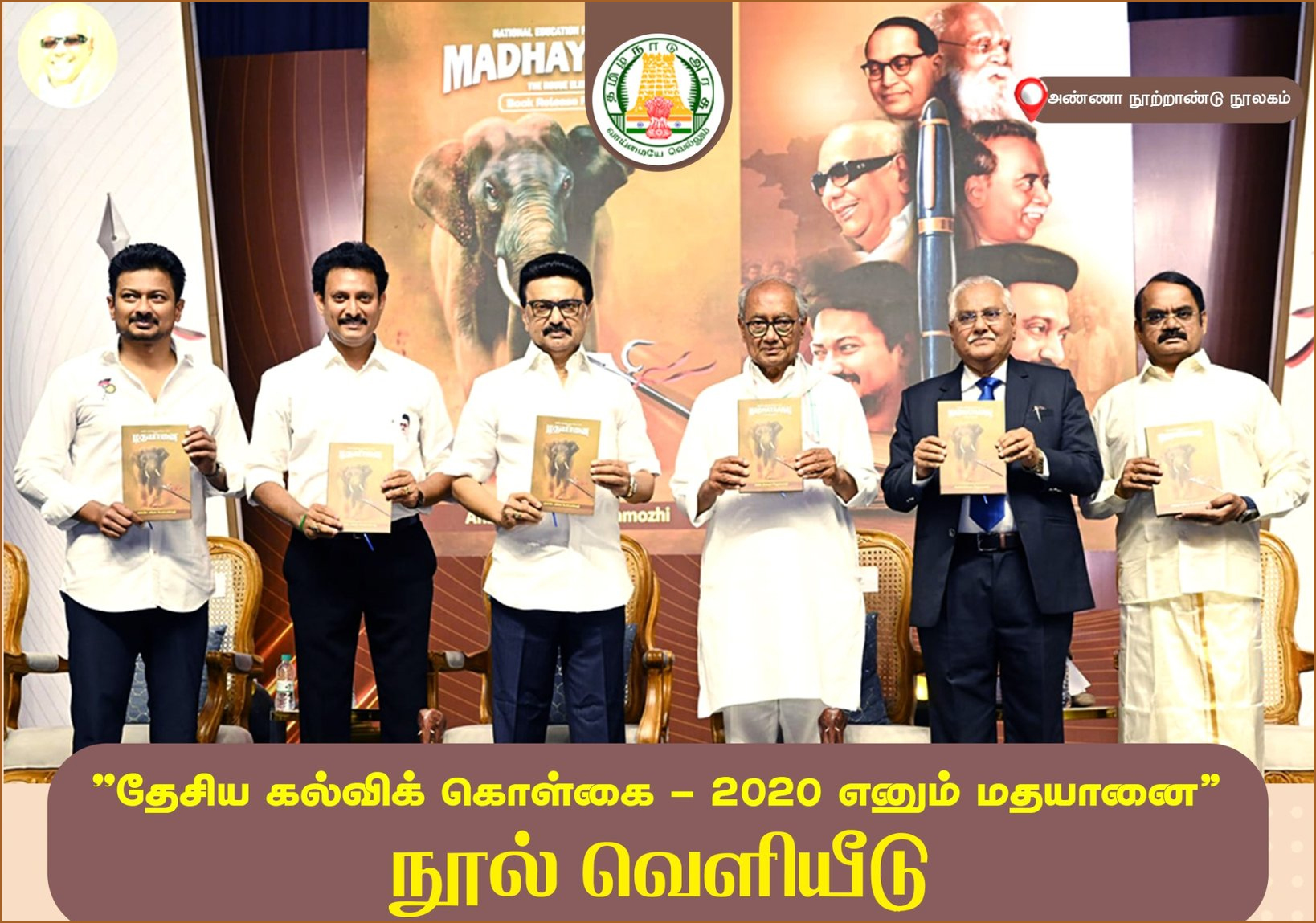 சென்னை, கோட்டூர்புரம், அண்ணா நூற்றாண்டு நூலகக் கலையரங்கில், பள்ளிக் கல்வித் துறை அமைச்சர் திரு.அன்பில் மகேஸ் பொய்யாமொழி அவர்கள் எழுதிய “தேசிய கல்விக் கொள்கை – 2020 எனும் மதயானை” நூல் வெளியீட்டு விழா நடைபெற்றது. இந்த நிகழ்ச்சியில் கலந்துகொண்ட முதலமைச்சர் ஸ்டாலின், நூலை வெளியிட,  அதனை மத்திய பிரதேச முன்னாள் முதலமைச்சர் திக் விஜய் சிங், மேனாள் உச்ச நீதிமன்ற நீதிபதி கோபால கவுடா, மேனாள் இஸ்ரோ இயக்குனர் மயில்சாமி அண்ணாதுரை ஆகியோர் பெற்றுக்கொண்டனர்.