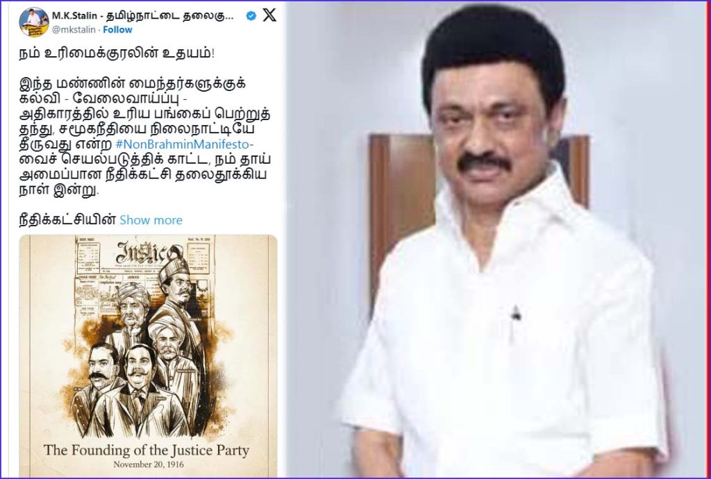 இந்த மண்ணின் மைந்தர்களுக்குக் கல்வி – வேலைவாய்ப்பு – அதிகாரத்தில் உரிய பங்கைப் பெற்றுத் தந்து, சமூகநீதியை நிலைநாட்டியே தீருவது என்ற #NonBrahminManifesto-வைச் செயல்படுத்திக் காட்ட, நம் தாய் அமைப்பான நீதிக்கட்சி தலைதூக்கிய நாள் இன்று.