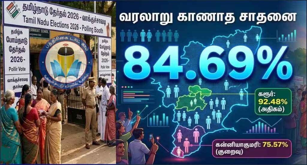 தமிழக சட்டமன்றத் தேர்தல் வரலாற்றில் புதிய உச்சமாக நேற்று (ஏப்ரல் 23) நடைபெற்ற சட்டமன்ற தேர்தல் வாக்குப்பதிவு புதிய வரலாற்று சாதனையை நிகழ்த்த்தி உள்ளது. இரவு 10 மணி நிலவரப்படி 84.51% (Approx 85%) வாக்குப்பதிவு நடைபெற்றுள்ளது என தேர்தல் ஆணையம் அறிவித்துள்ளது. கடந்த 2021 ஆம் ஆண்டு தேர்தலை விட 2026 தேர்தலில் வாக்குப்பதிவு சதவீதம் பெருமளவு அதிகரித்துள்ளது.