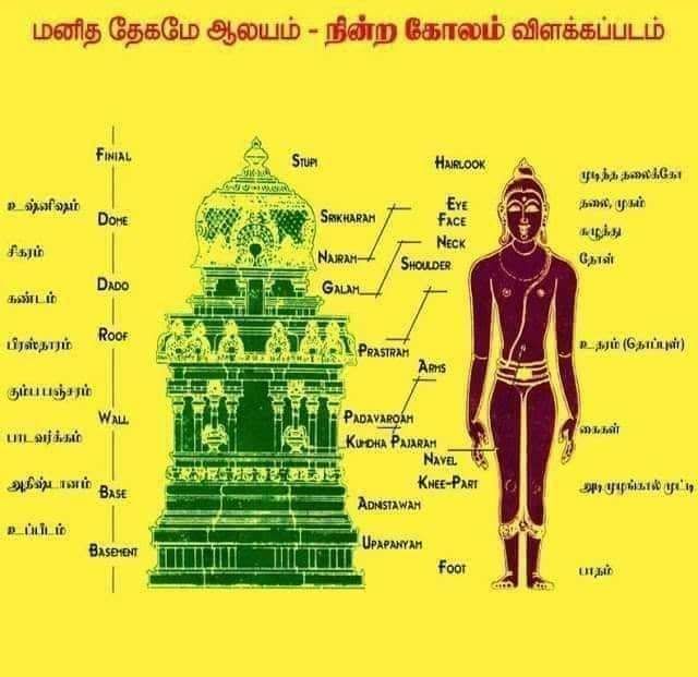 ஆகம விதிப்படி எழுப்பப்பட்ட கோவிலில் மனித உடலைப் போலவே அமைக்கப்பட்டிருக்கும். அது எப்படியெனில்
