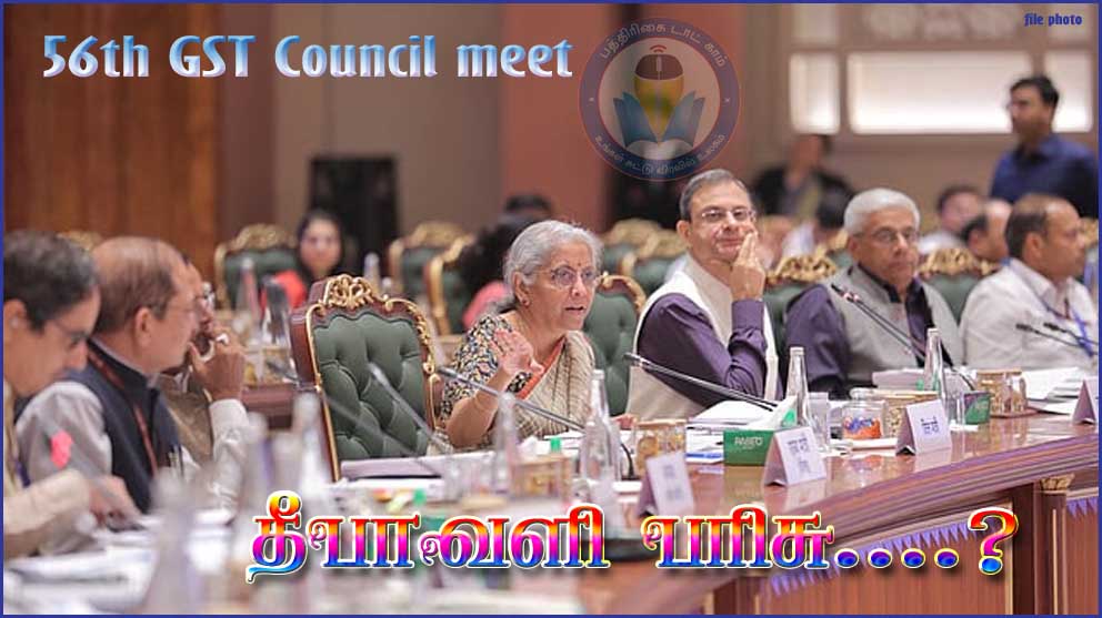 டெல்லி: பரபரப்பான கட்டத்தில் இன்று கூடுகிறது 56-வது ஜிஎஸ்டி கவுன்சில் கூட்டம்.   இந்த கூட்டத்தில், ஏற்கனவே பிரதமர் மோடி தெரிவித்தபடி, ஜிஎஸ்டி வரி குறைக்கப்பட்டு, பொதுமக்களக்கு தீபாவளி பரிசு கிடைக்குமா? என்ற எதிர்பார்ப்பு எழுந்துள்ளது.