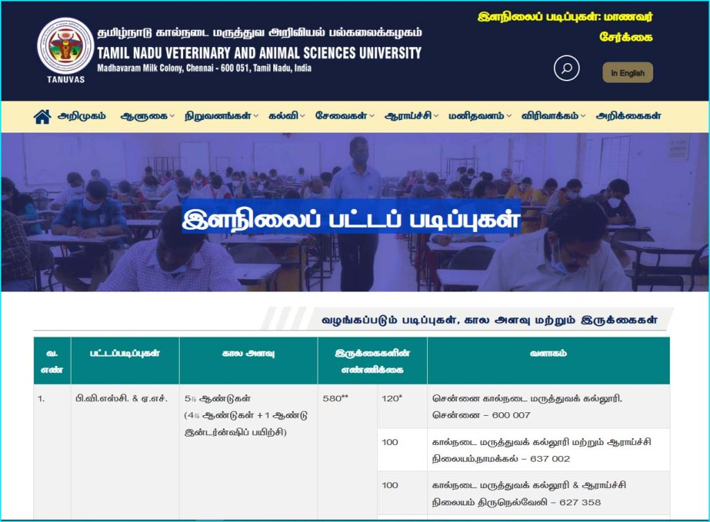 கால்நடை மருத்துவ பல்கலைக்கழகம் சார்பில் வழங்கப்படும் இளநிலை பட்டப்படிப்புகள் தொடர்பான முழு விவரம் காண கீழே உள்ள இணையதளத்தை பார்க்கலாம்.